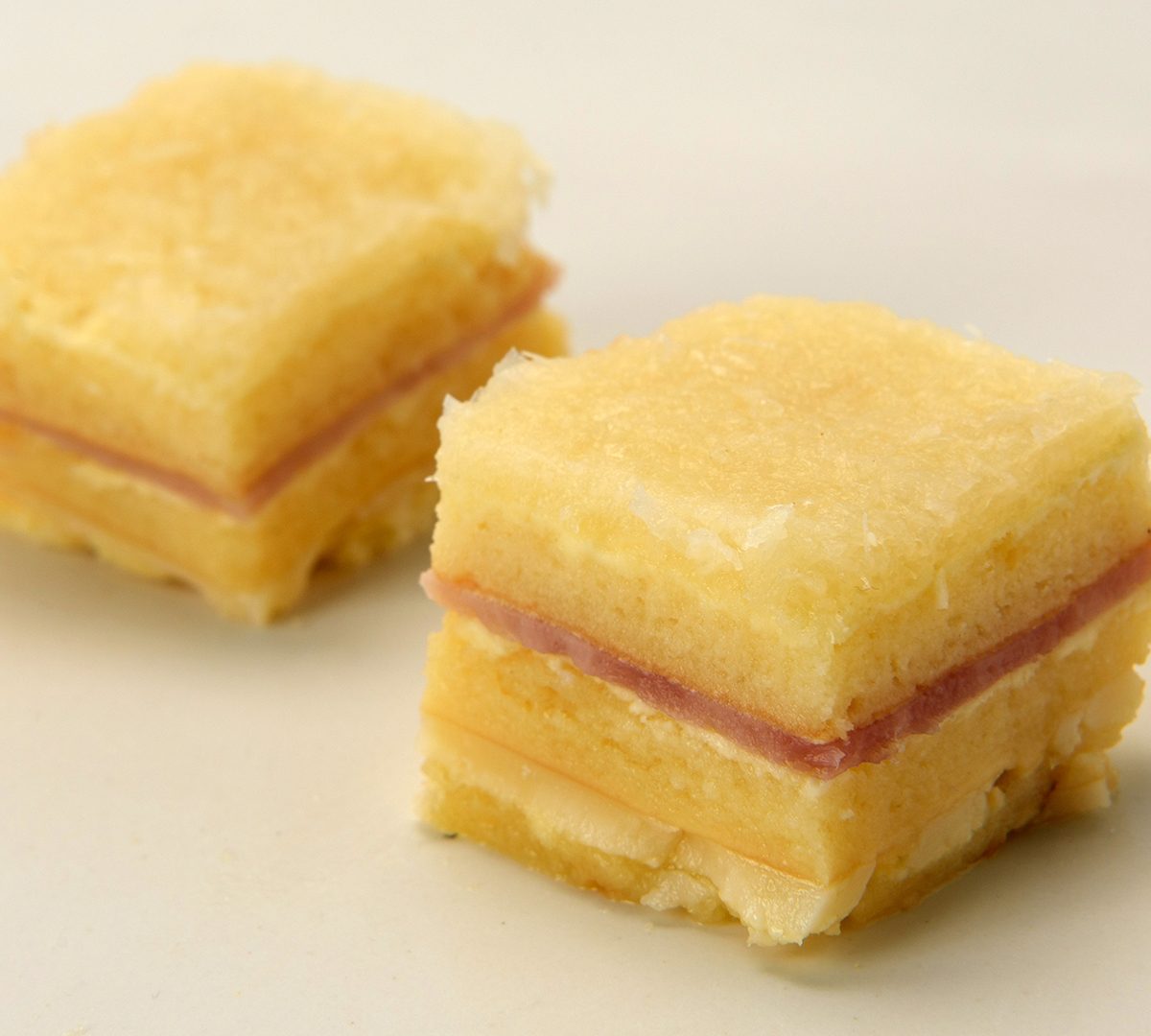 Delgadas capas de bizcochuelo rellenas de jamón y queso, con ananá glaseado