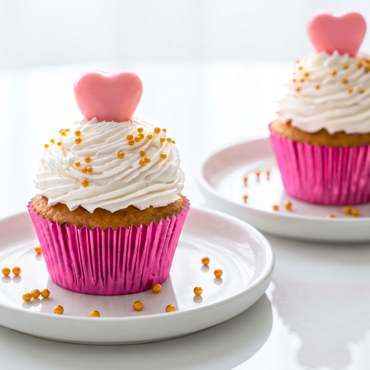 Muffin de vainilla, ganache de chocolate blanco con decorado con corazón y perlas doradas.